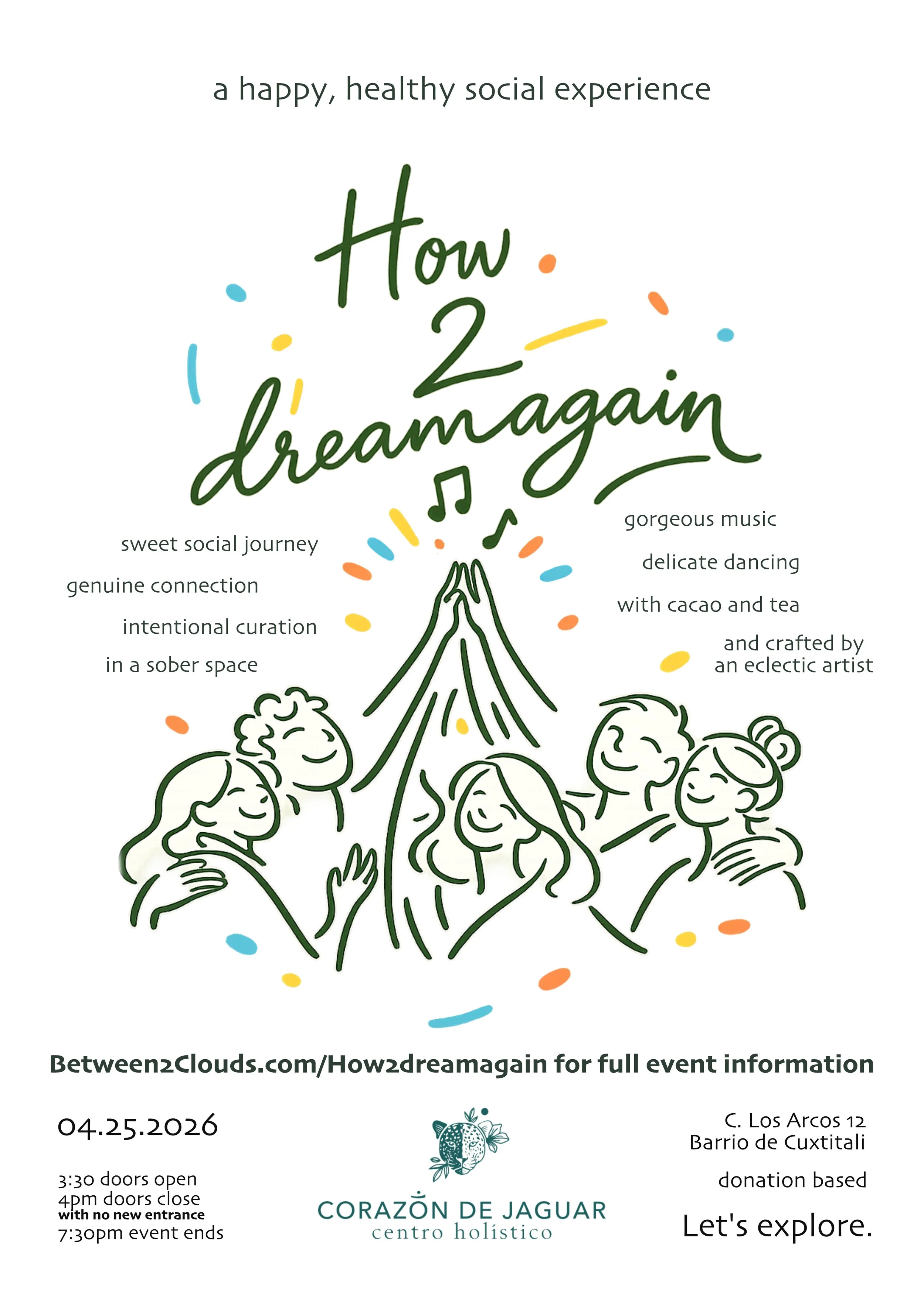 It is not an experience you have had before, it is wholesome, sweet, easy to partake in, and extremely impactful. There is no religion or spirituality you need to engage with, just being with people, sharing a bit about yourself, listening, listening to some music, drinking some tea and cacao if you’d like, dancing if you’d like, chatting, hanging out, and being intentional about it. You’ll be guided through the process of how to do this in a sweet way.